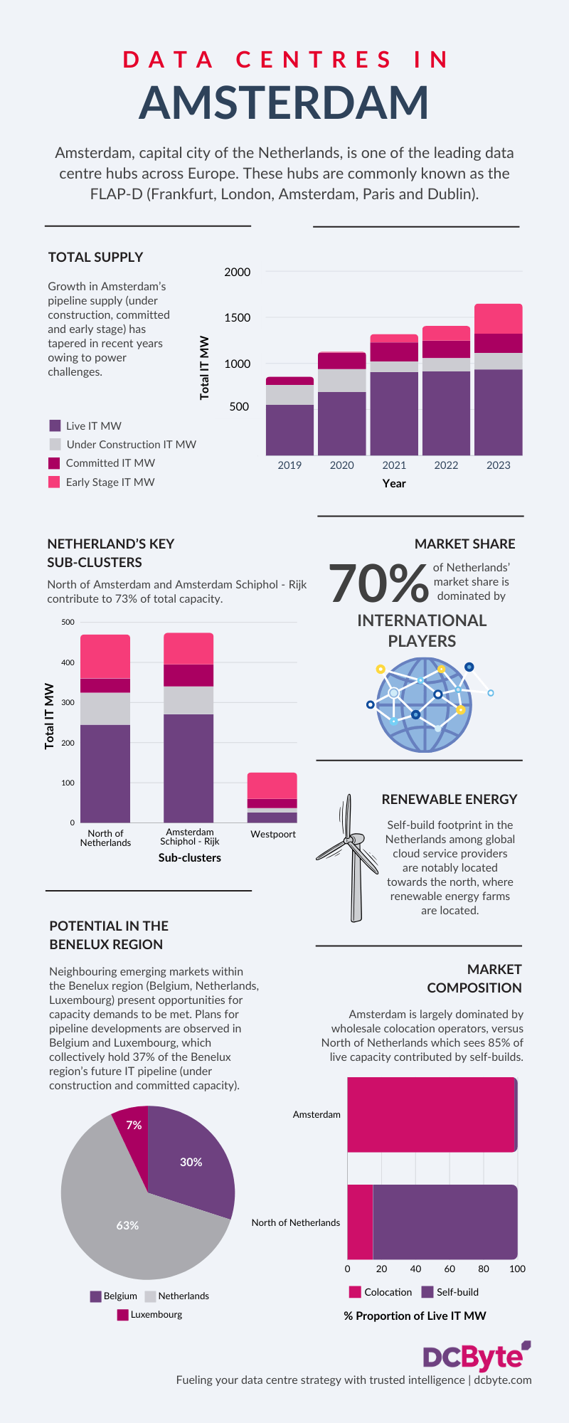 Read on to our infographic for a snapshot of the Amsterdam data centre market, covering aspects such as the supply, data centre clusters, market share and more.