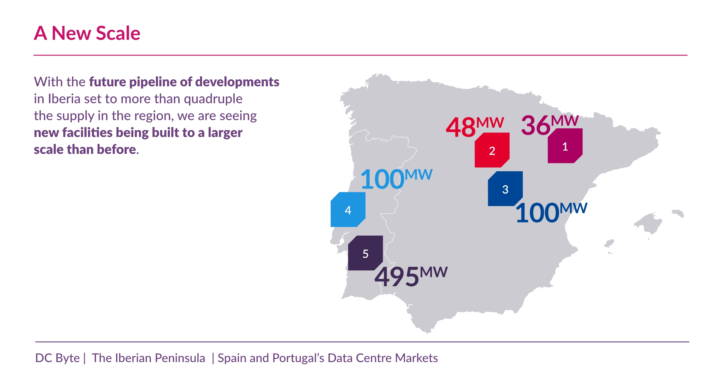 With the more recent arrival of hyperscalers such as AWS and Microsoft in Spain, market growth in the country – and Iberia as a whole – has shown considerable growth. Relative to its current live capacity, the region now faces a development pipeline which will more than quadruple its current size, with increasingly large developments planned across the peninsula.