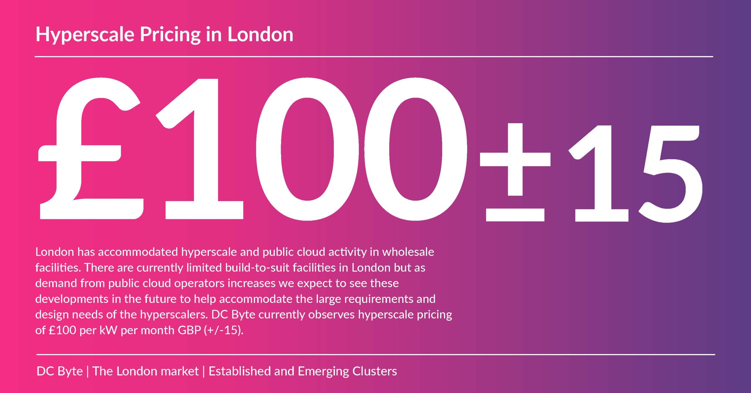 While London’s colocation capacity contributes significantly to its live IT load, the presence of hyperscalers like AWS and Microsoft indicates a growing appetite for wholesale data centre development. The city’s hyperscale pricing of £100 per kW per month GBP (+/-15) demonstrates the potential for accommodating large requirements and the design needs of these tech giants.