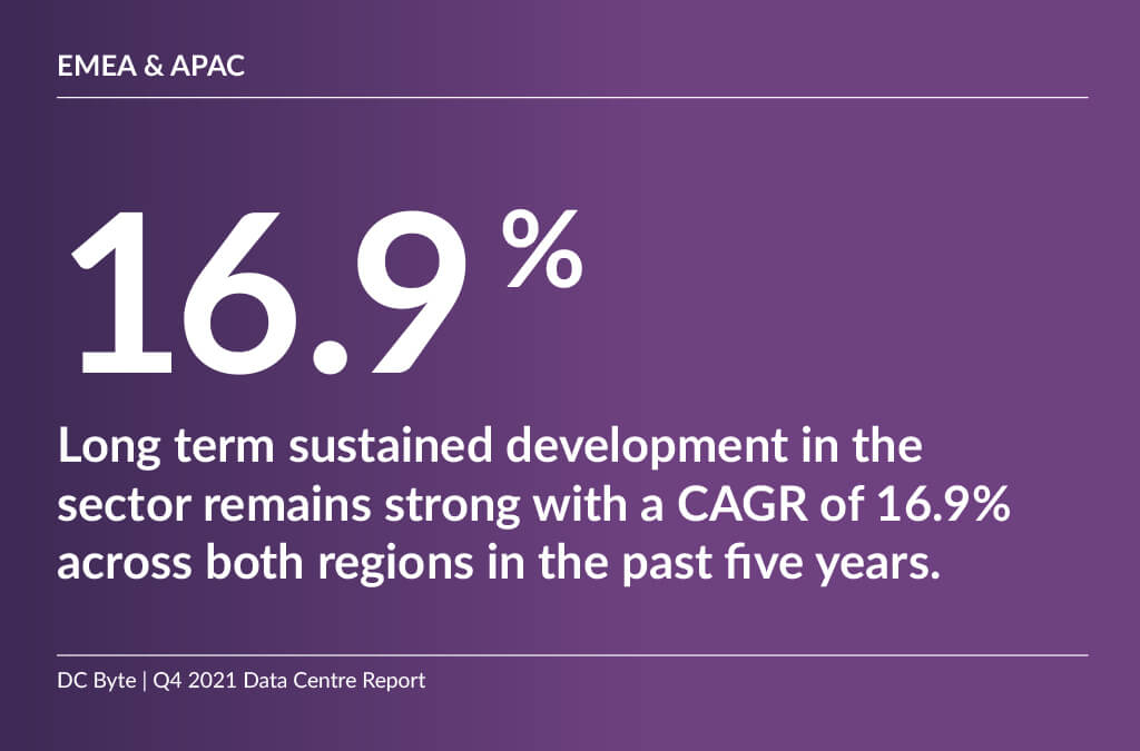 “EMEA and APAC continue to jostle for supremacy,” said Ed Galvin, Founder and CEO at DC Byte. “2021 saw EMEA cooling off slightly after the incredible 2.627GW growth we saw in 2020, with 1.582GW of new supply. Long term sustained development in the sector remains strong with a CAGR of 16.9% across both regions in the past five years. 2021 was the first year following the surge in demand for data centre space and it’s great to see the industry continuing to provide new capacity in the face of increasing challenges around power availability and land pricing.”