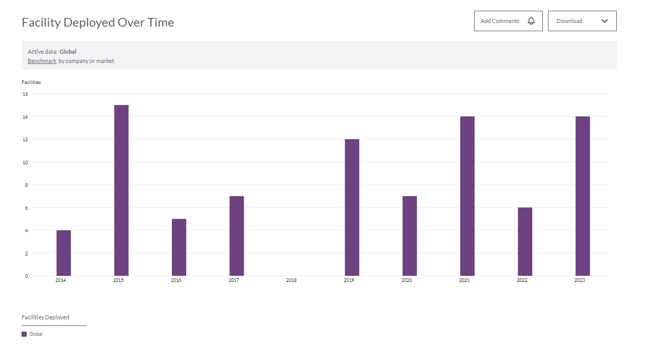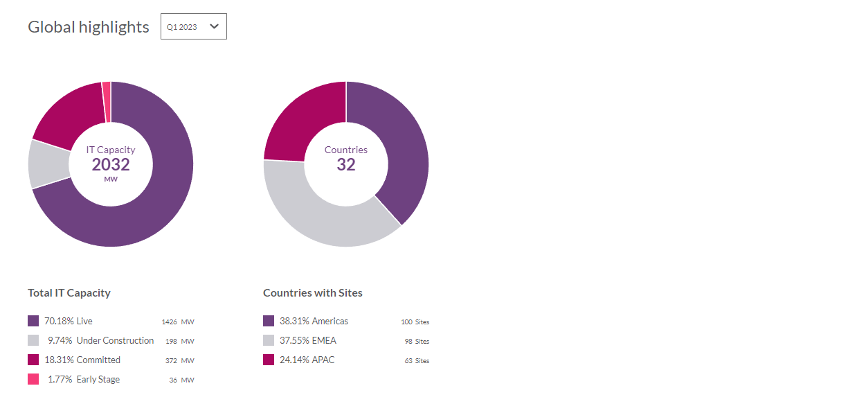 Get a global overview of a company’s data center assets, dissected by capacity category and geographical region.