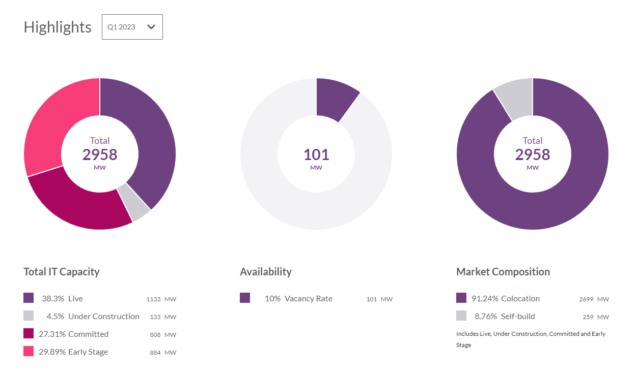 Deep dive into market capacity categories broken down by type of facility (colocation or self-build facilities), capacity category (live or pipeline) as well as vacancy status (available or contracted).