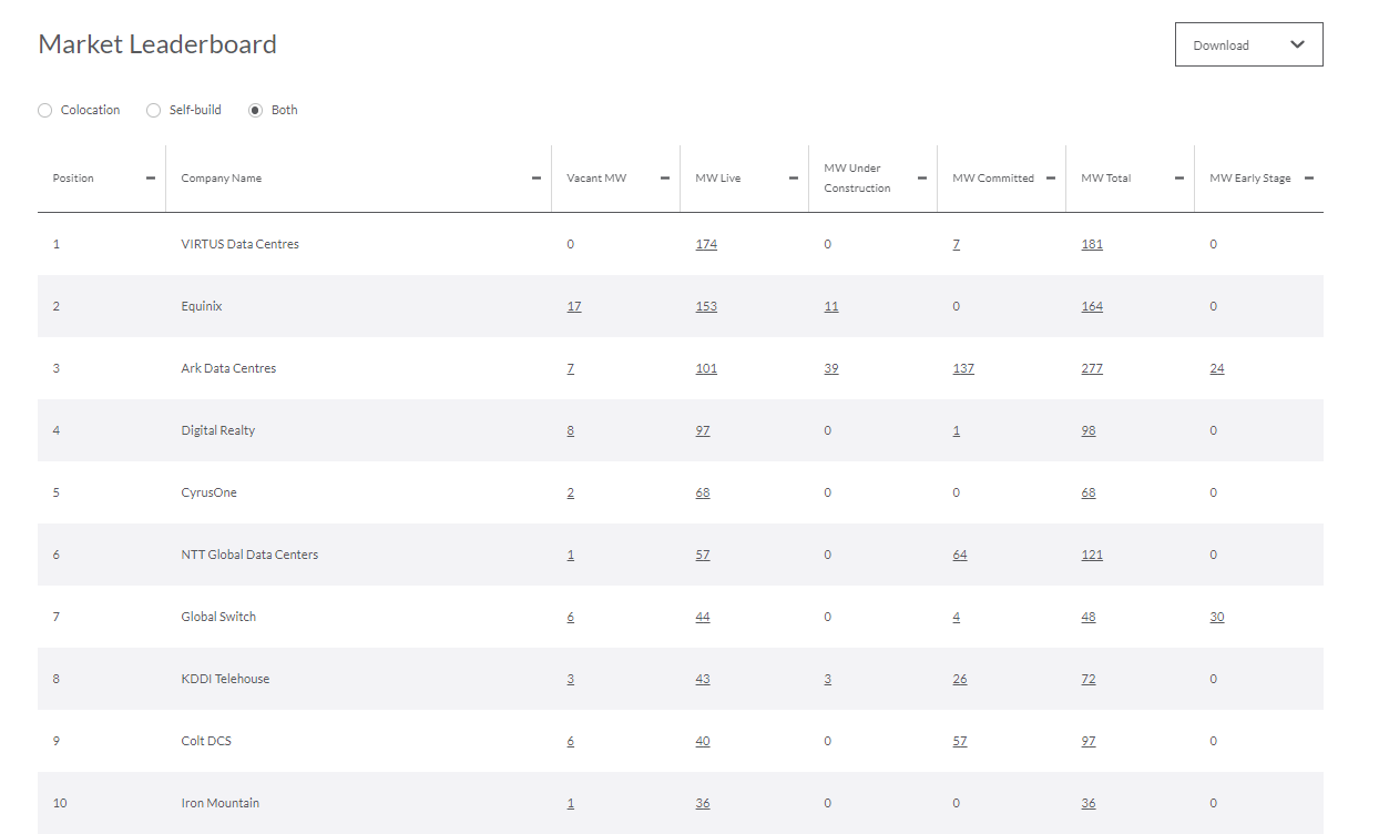 View data center assets by operators and gain instant insights on their footprint across geographies. Sort their facilities by capacity and see where they rank on leaderboards across global markets.