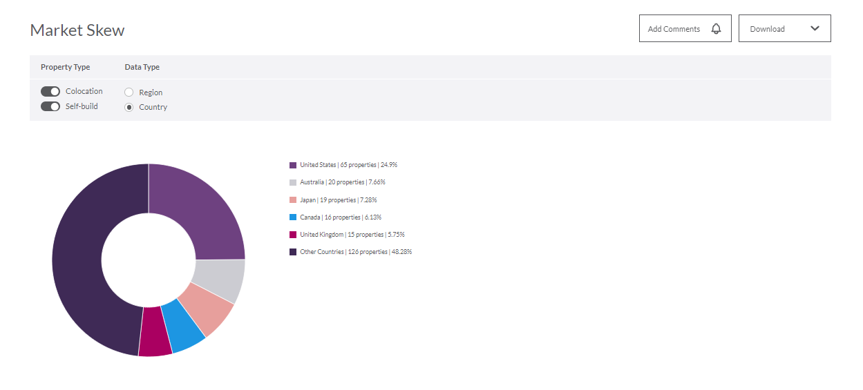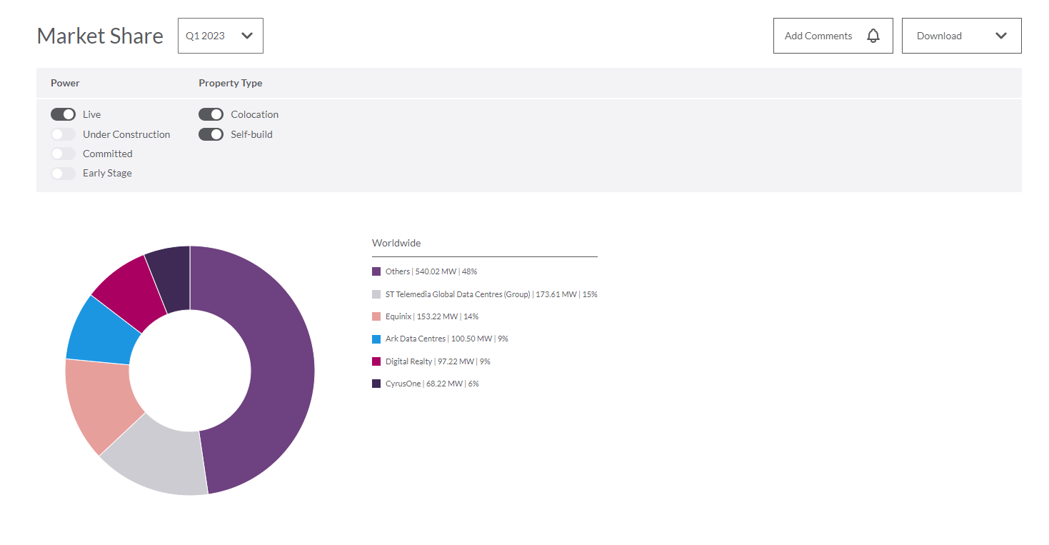 Dive into data center market insights by region or specific markets in Americas, APAC or EMEA, get access to raw data for any market, customize your views by segment and pull reports at the touch of a button.