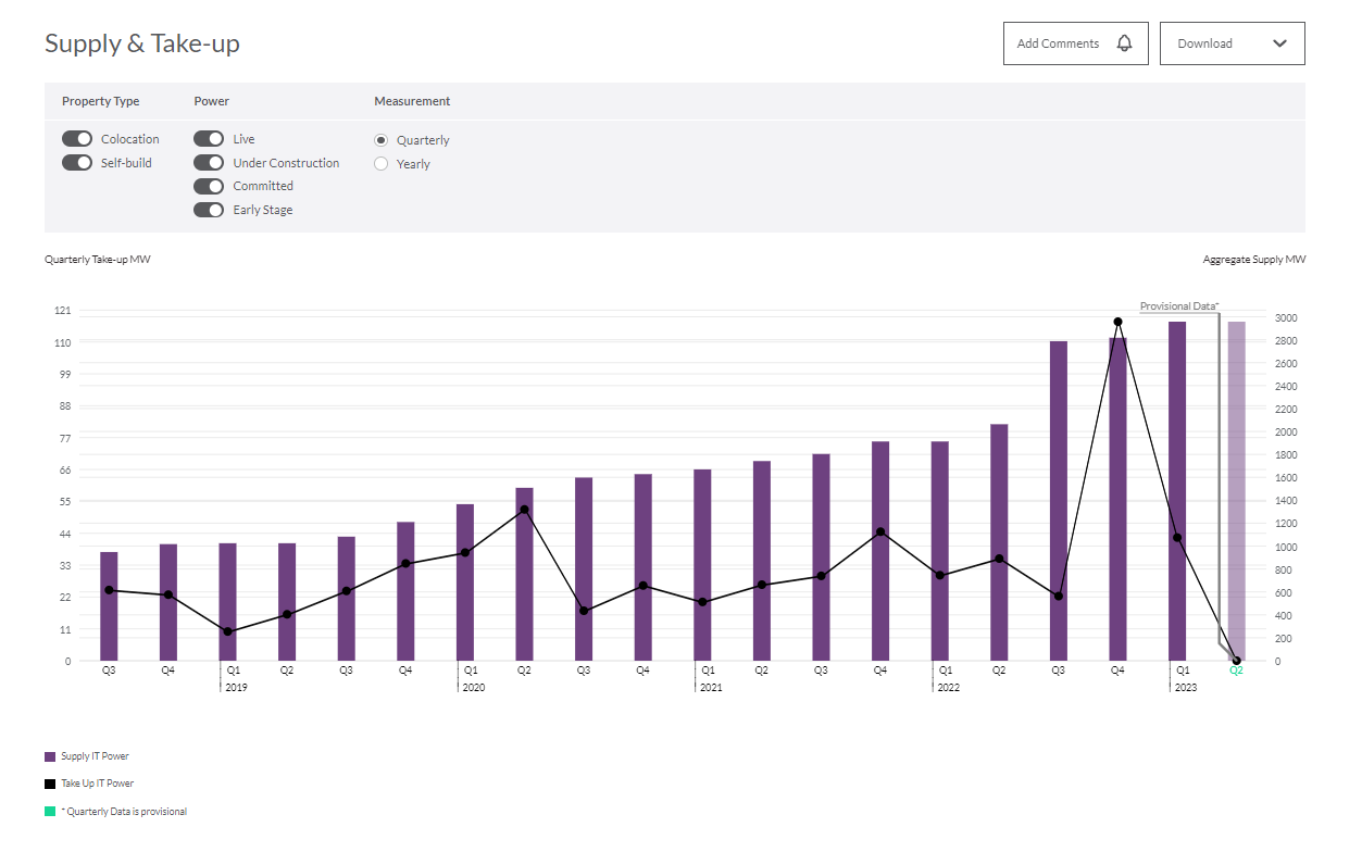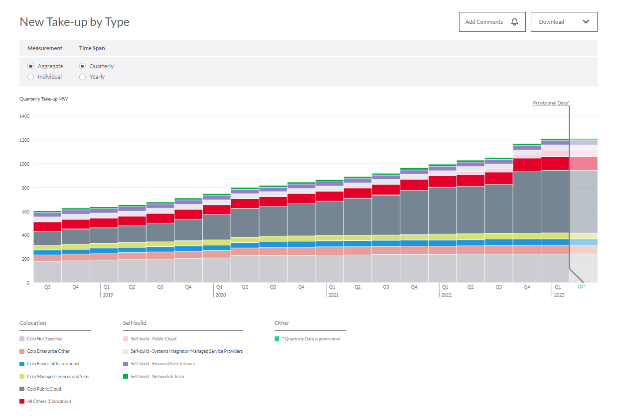 Track take-up distributions across different clients types. Self-build capacities categorized by type of operator. Gain insights on trends by the quarter or year.